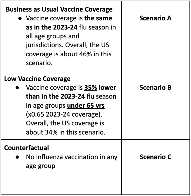 - Estimates of vaccine benefits should be interpreted in light of a high assumed VE against hospitalizations (50%), which anticipates a good match between circulating viruses and vaccine strains. Further, projections assume a high vaccine uptake among individuals over 65 yrs who suffer higher hospitalization and death burden. Lastly, indirect vaccine benefits are theoretically amplified in low influenza transmission seasons and most models project a fair probability of a low transmission season.
