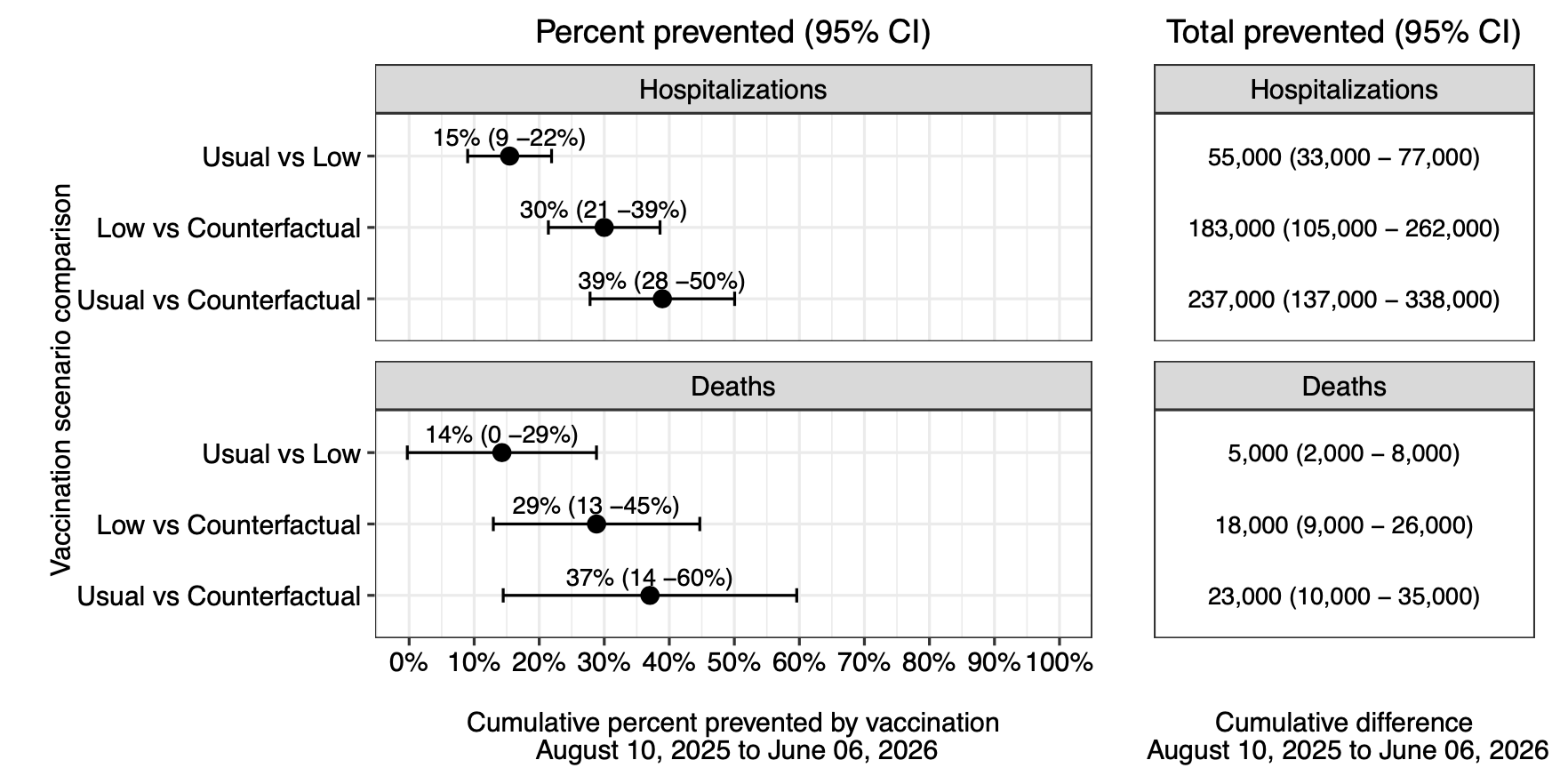 - In the business-as-usual vaccination scenario, cumulative burden for this season is projected to reach 316,000 (95% PI: 94,000-680,000) hospitalizations and 35,000 (95% PI: 14,000-48,000) deaths.